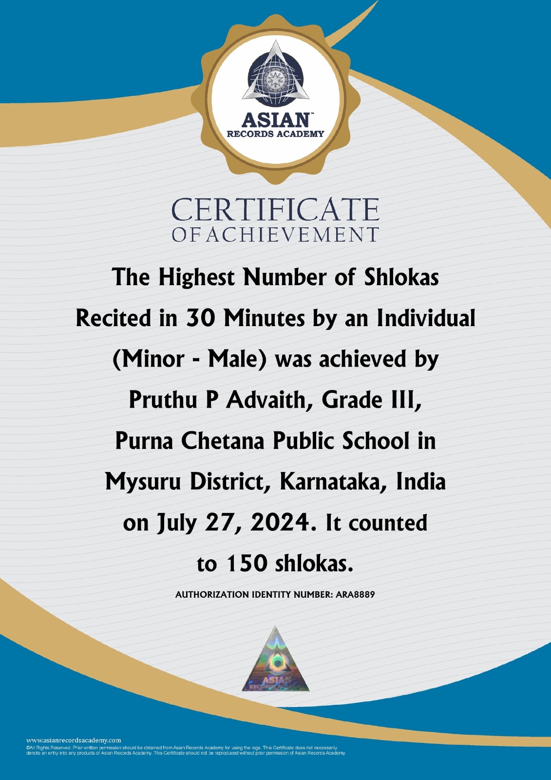 Most Shlokas Recited in 30 Minutes by an Individual (Minor-Male)